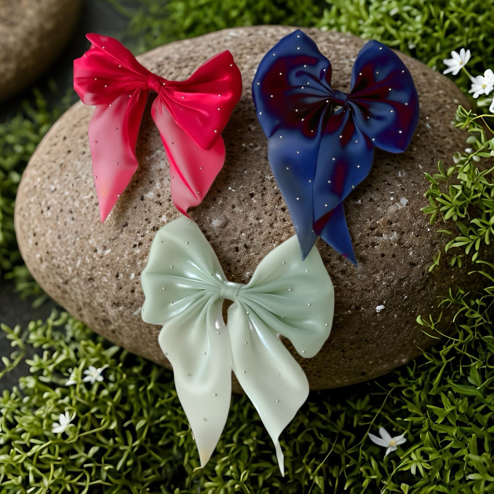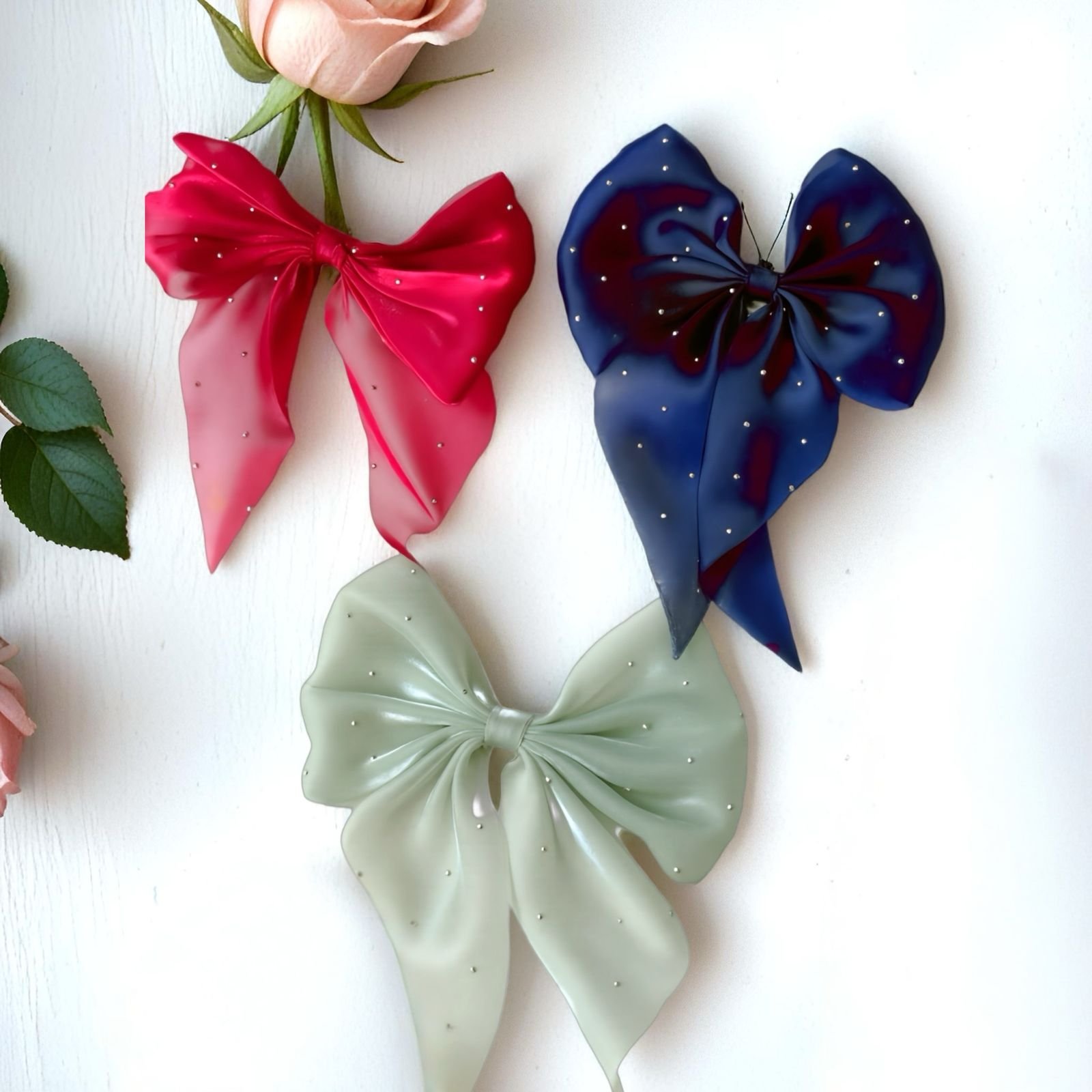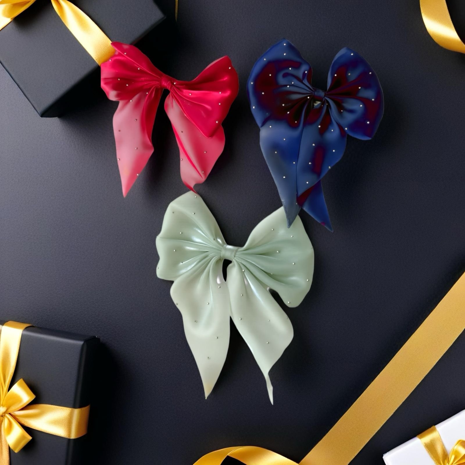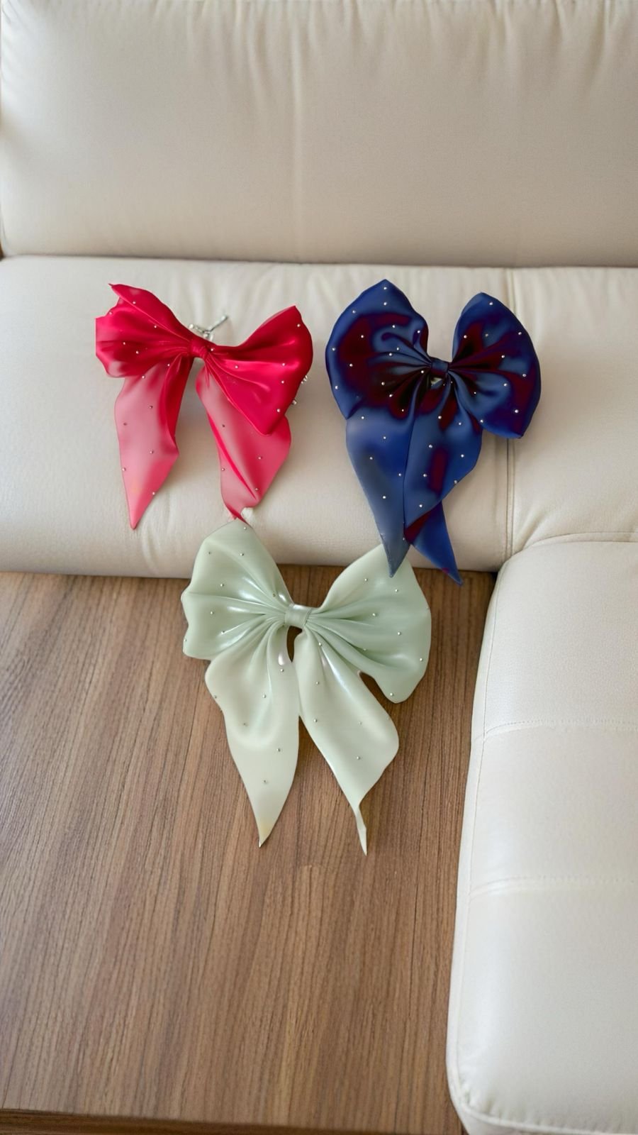 Add a spark of elegance with the Premium Net Bow – beautifully crafted with a translucent net finish and delicate pearl-like dots. Available in red, navy blue, and pastel green.